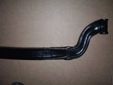All axles are straightened if necessary, kingpin bores are resized if needed, and all axles are Magnafluxed before shipping. We also can fill the ends of the axle for $150.00 and drill the center for $175.00. You have a choice of stretch drop or conventional drop. The difference is stretch drop maintains the original width within 1/8 of an inch, while a conventional drop shortens the axle approximately 3/4 of an inch per side. We can also drop 37-41 Ford axles, if needed. Below are pictures of axles that are conventional drops or Old Style drops. In the first picture the top one is a 4" dropped Model A. The next one is a 4" dropped 33-36 Ford axle. The third axle is a 4" dropped 32 heavy axle. The last one is a 5" dropped and drilled 32 heavy. We drill the 32's with 1" holes on 1 1/2" centers and the Model A's and 33-36's can be drilled with 7/8" holes on 1 3/8" centers. All holes are drilled with a vertical end mill using drill jigs to keep hole alignment and spacing exact. The next set of pictures are close ups of the bends and holes so that you can see the details more clearly.